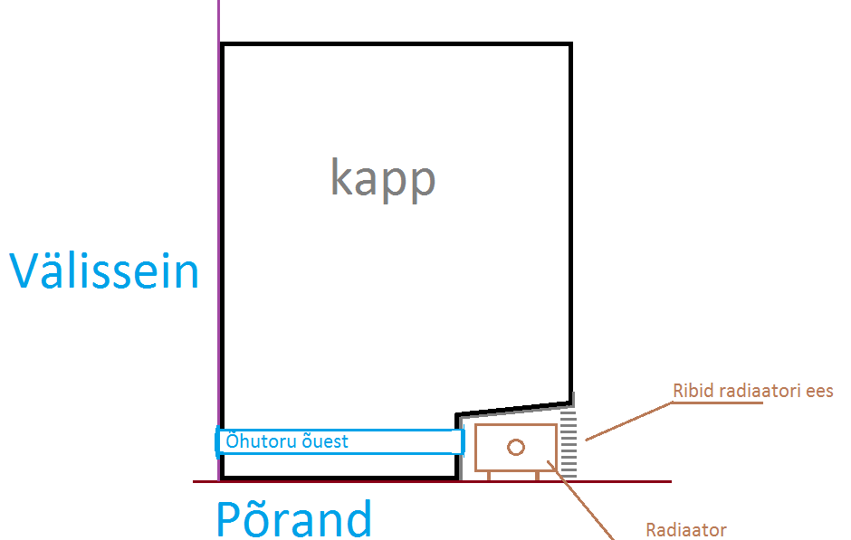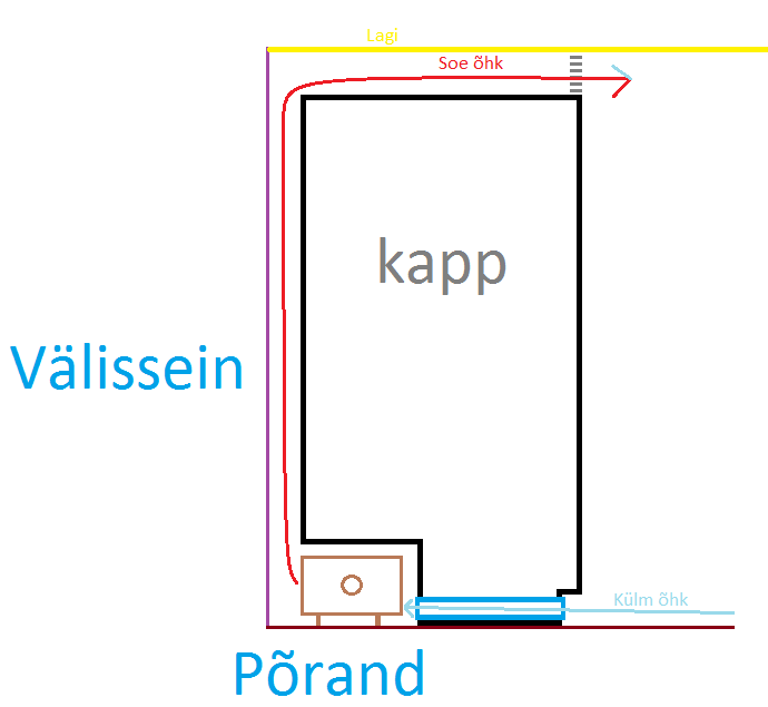 Ega see polegid nii väga minu mõte. Umbes nii käibki põhjamaa elamutel. Kappi pole vaja eraldi seinast eemale teha. Lihtsalt radikas on kapis, allääres välisseina vastus. Õhul antakse võimalus ringi liikuda (all ja ülal pilud). Diivani alused istemad on ka kahekordse põhjaga, et õhk ringelda saaks.karuanton kirjutas: Motamees, kas sinu mõte on niimoodi?
